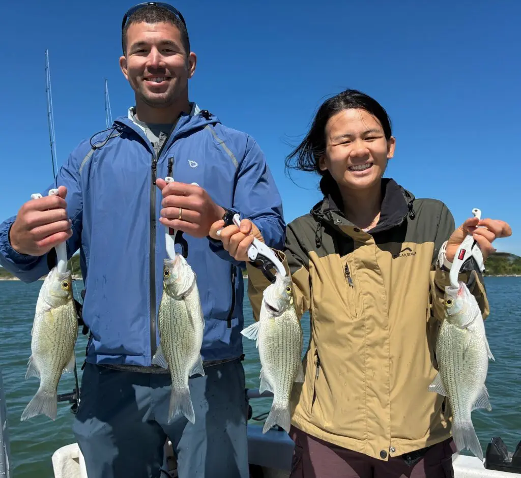 By the end of 4.25 hours time, these very coachable beginners wound up with a 102-fish catch including 101 white bass and one 4.50-pound hybrid striped bass.