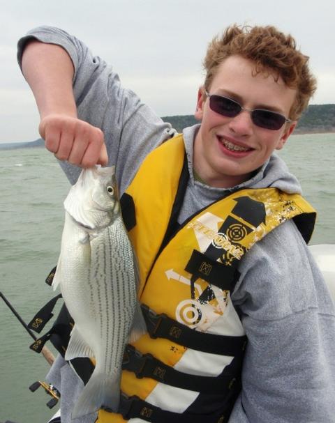 Daniel M. of Round Rock with a stocky hybrid striped bass — our first fish taken on downriggers in this calendar year!