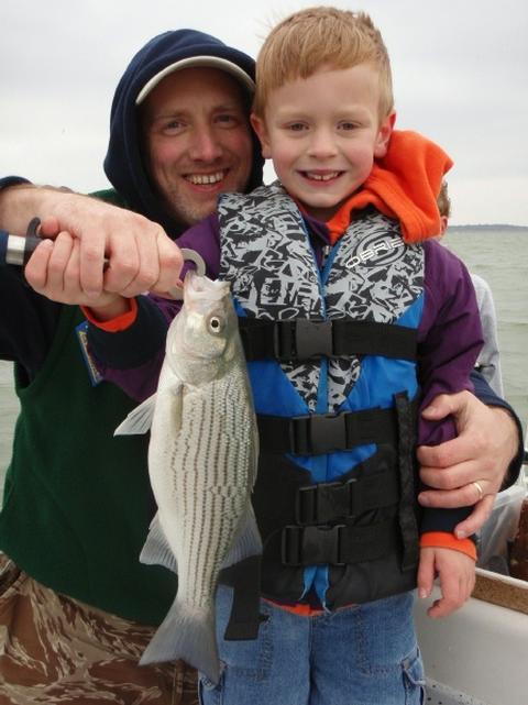 Jackson M. and his dad, Kris, with a hard-fighting hybrid taken on Jackson’s first fishing trip of his life.