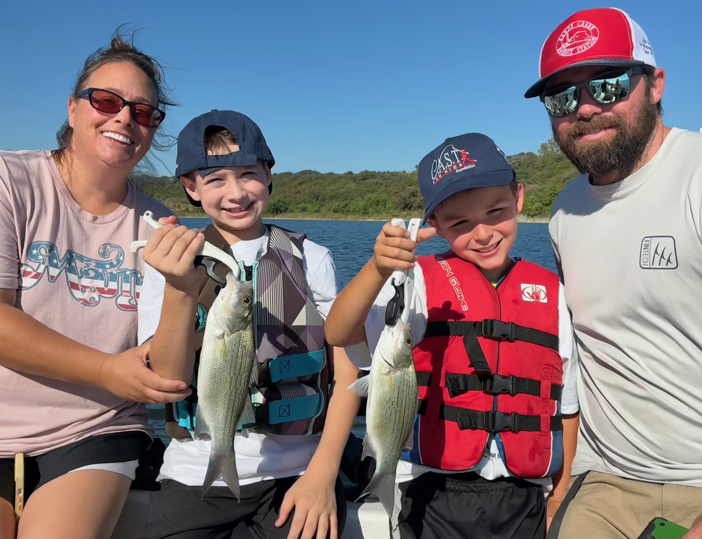 PHOTO CAPTION: From left:  LeeAnn & Alexander Hildebrand and Blake Eppert and James Grunert came aboard my boat for Belton Lake’s 2025 CAST event.  The boys split a catch of 30 fish made in right at 2.5 hours’ time.