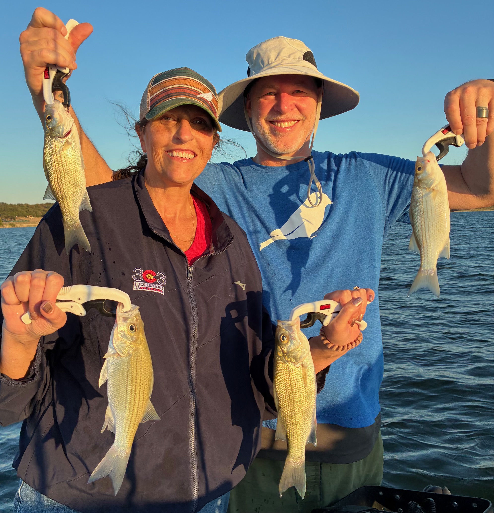 We fished from 3:15 until just after sunset at 7:15 PM. As is often the case on afternoon trips, our first hour was a bit slow, but, we still managed to find good congregations of bottom-oriented white bass in 34 to 40 feet of water. These fish were very picky. Whenever a school passed beneath the boat, as witnessed on Garmin LiveScope, the very first time we worked through them vertically from off the bottom, we would typically get aggressive chases, and, if we were going to catch fish from that school, that’s when the catch would happen. After letting the MAL Heavy lures return to the bottom, if the fish were still present, they seemed to lose interest very, very quickly.