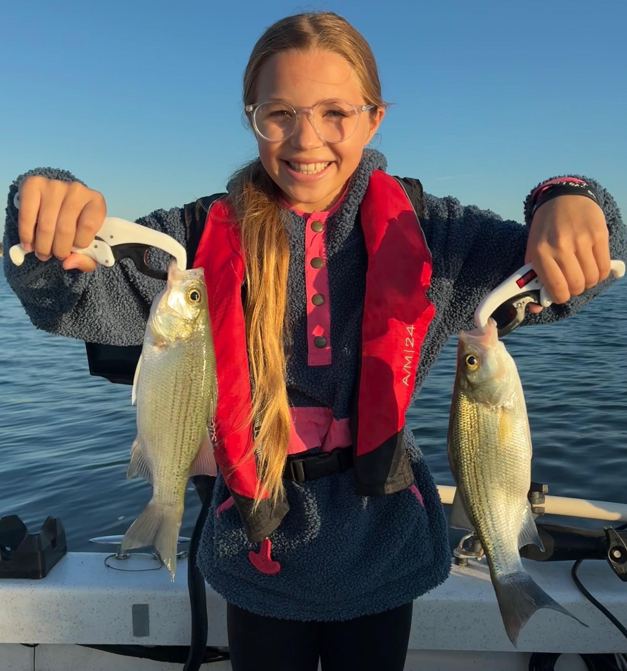 PHOTO CAPTION: Kinsley Bailey celebrated her 12th birthday on the water with her mom and dad thanks to a day off from school for Columbus Day. She singlehandedly put 36 fish in the boat, including white bass, catfish, and panfish, using four very different tactics.