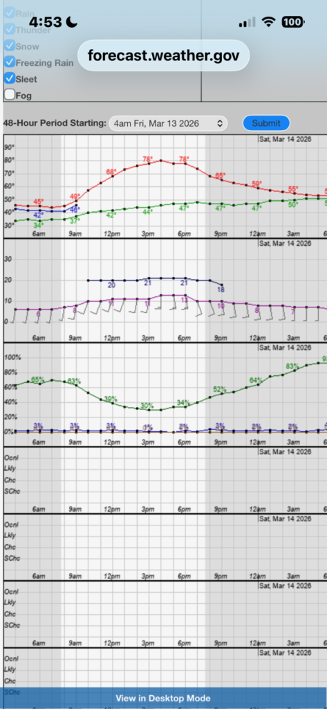 This trip was originally scheduled for Monday morning, March 16, but the forecast called for the bottom to drop out weatherwise from Sunday into Monday as a significant cold front blasted Central Texas with low temps and high winds.