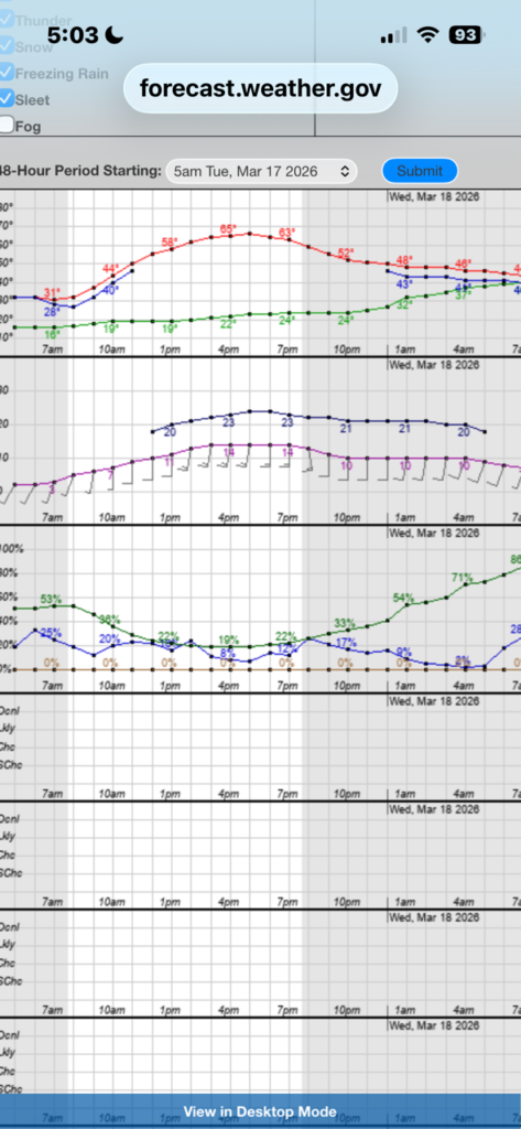 This morning, Tuesday, we were just below freezing area wide. So, a sudden cooldown to chill the water, and lots of wind to stain the water normally does not bode well. On the other hand, the water was in the low 60s going into this event and days are getting longer, plus, we had a returning south wind start in the early morning hours as positives.